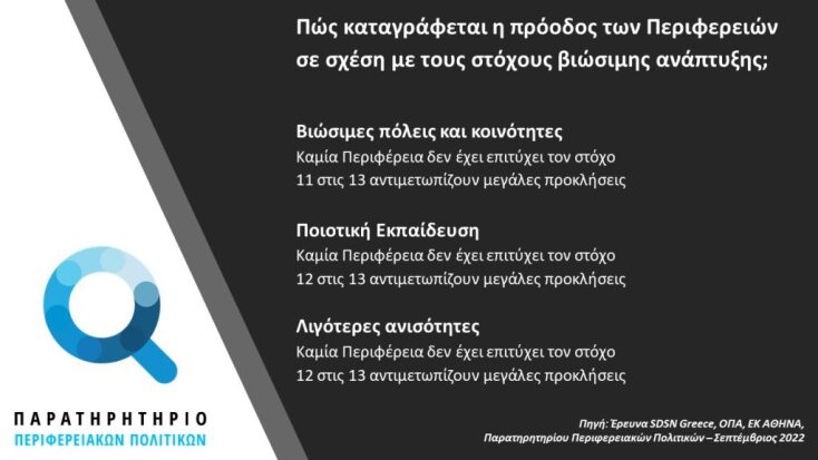 Η Περιφέρεια Θεσσαλίας είναι η μόνη ελληνική περιφέρεια που έχει ήδη εκπληρώσει τις απαιτήσεις για την βιωσιμότητα έως το 2030, κατά περισσότερο από 50%. Οι Περιφέρειες Ιονίων Νήσων, Ανατολικής Μακεδονίας και της Θράκης, καθώς και Δυτικής Μακεδονίας φαίνεται να αντιμετωπίζουν κάποιες δυσκολίες. Από την άλλη πλευρά, οι Περιφέρειες Αττικής, Νοτίου Αιγαίου και Κρήτης θα πρέπει να προσπαθήσουν περισσότερο για να ξεπεράσουν σημαντικές προκλήσεις για την επίτευξη των ΣΒΑ έως το 2030, δεδομένου ότι πάνω από το 60% του ελληνικού πληθυσμού κατοικεί στις περιοχές αυτές (Eurostat, 2022).