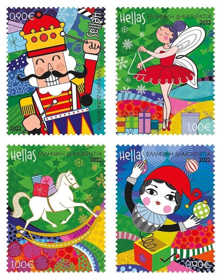 Με αυτήν την έμπνευση, τα εφετινά γραμματόσημα, εκτός από τον Καρυοθραύστη, απεικονίζουν αγαπημένα παιδικά παιχνίδια: Η Μπαλαρίνα ψάλει τα κάλαντα με το χαρακτηριστικό χριστουγεννιάτικο τρίγωνο, ο Αρλεκίνος πετάγεται από το μουσικό κουτί κρατώντας χριστουγεννιάτικα στολίδια και το Κουνιστό Αλογάκι μεταφέρει στην πλάτη τα δώρα.