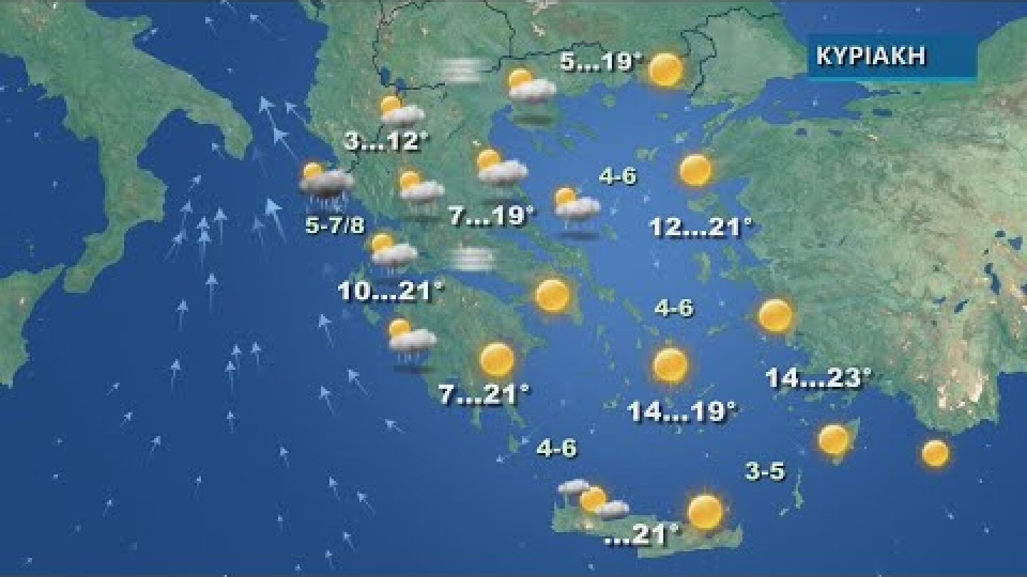 - Ανεμοι: Στα νησιά του ανατολικού Αιγαίου ανατολικοί βορειοανατολικοί 4 με 5 και στα βόρεια πρόσκαιρα μέχρι το μεσημέρι τοπικά έως 6 μποφόρ, στρεφόμενοι τις μεσημβρινές ώρες σε βόρειους βορειοανατολικούς. Στα Δωδεκάνησα μεταβλητοί 3 με 4 και βαθμιαία βόρειοι βορειοδυτικοί 4 με 5 μποφόρ.