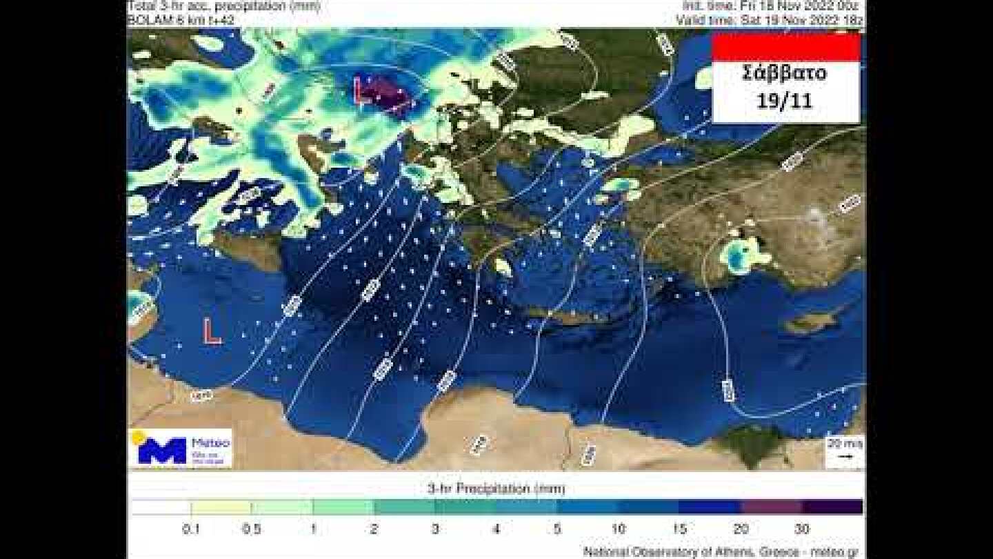 Στο παρακάτω βίντεο, απεικονίζεται η κίνηση των βαρομετρικών χαμηλών, με τα εκτιμώμενα ύψη βροχής και το πεδίο των ανέμων ανά τρίωρο, όπως υπολογίστηκαν από το αριθμητικό μοντέλο πρόγνωσης καιρού του Εθνικού Αστεροσκοπείου Αθηνών / Meteo.gr, από τις μεσημεριανές ώρες της Παρασκευής 18/11 έως τις μεσημεριανές ώρες της Δευτέρας 21/11/2022.
