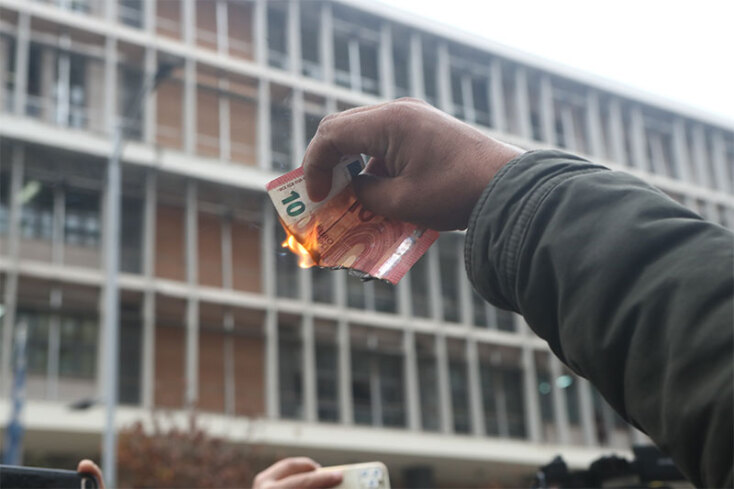 Ορισμένοι προχώρησαν και σε μια συμβολική κίνηση. Συγκεκριμένα, έκαψαν χαρτονομίσματα, θέλοντας όπως λένε να δείξουν την ανύπαρκτη αξία των χρημάτων μπροστά στην ανθρώπινη ζωή.