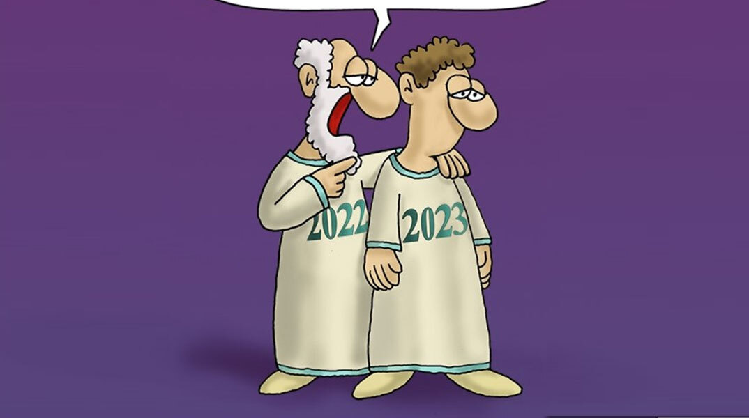 Ο σκιτσογράφος παρουσιάζει τον γέρο χρόνο (2022) να συμβουλεύει τον καινούργιο (2023) που έρχεται σε λίγες ώρες.