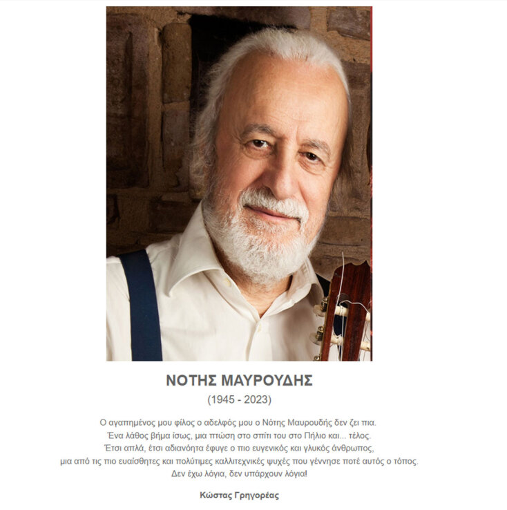 Όπως έγινε γνωστό, ο γνωστός συνθέτης, κιθαρίστας και μουσικός πέθανε μετά από πτώση από ύψος. Ο Νότης Μαυρουδής βρισκόταν στο σπίτι με τη σύζυγό του στο Πήλιο.