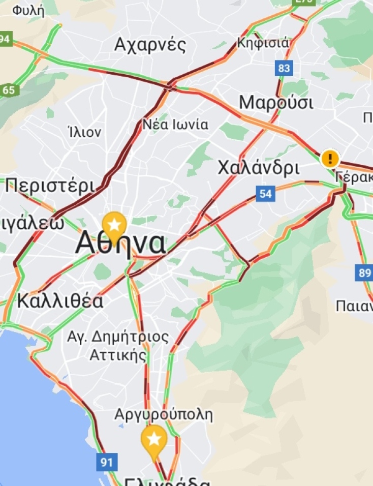 Μποτιλιάρισμα ανά τμήματα στην κάθοδο της Λεωφόρου Κηφισού από το ύψος του κτήματος Συγγρού στο Μαρούσι μέχρι και τους Αμπελόκηπους. Μεγάλες καθυστερήσεις και στη Λεωφόρο Βεΐκου προς τη Λεωφόρο Γαλατσίου και προς τη Λεωφόρο Καποδιστρίου. Αρκετά δύσκολη και η Καποδιστρίου από το ύψος του νοσοκομείου Αγία Όλγα έως και τη Λεωφόρο Κηφισίας.