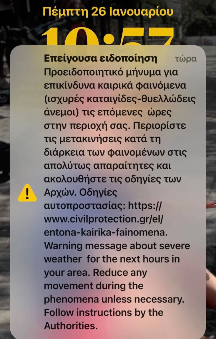 Για την κακοκαιρία μήνυμα 112 εστάλη και στη Μαγνησία. Κάτοικοι στον Βόλο καλούνται να περιορίσουν τις μετακινήσεις τους.