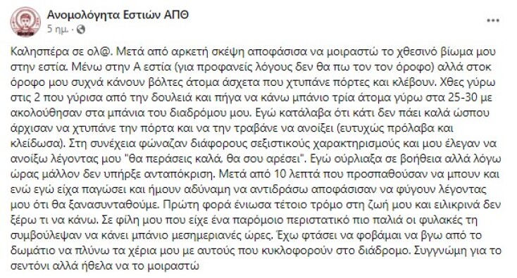 «Καλησπέρα σε ολ@. Μετά από αρκετή σκέψη αποφάσισα να μοιραστώ το χθεσινό βίωμα μου στην εστία. Μένω στην Α εστία (για προφανείς λόγους δεν θα πω τον όροφο) αλλά στον όροφό μου συχνά κάνουν βόλτες άτομα άσχετα που χτυπάνε πόρτες και κλέβουν. Χθες γύρω στις 2 που γύρισα από τη δουλειά και πήγα να κάνω μπάνιο, τρία άτομα γύρω στα 25-30 με ακολούθησαν στα μπάνια του διαδρόμου μου. Εγώ κατάλαβα ότι κάτι δεν πάει καλά ώσπου άρχισαν να χτυπάνε την πόρτα και να την τραβάνε να ανοίξει (ευτυχώς πρόλαβα και κλείδωσα). Στη συνέχεια φώναζαν διάφορους σεξιστικούς χαρακτηρισμούς και μου έλεγαν να ανοίξω λέγοντας μου "θα περάσεις καλά, θα σου αρέσει". Εγώ ούρλιαξα σε βοήθεια αλλά λόγω ώρας μάλλον δεν υπήρξε ανταπόκριση. Μετά από 10 λεπτά που προσπαθούσαν να μπουν και ενώ εγώ είχα παγώσει και ήμουν αδύναμη να αντιδράσω αποφάσισαν να φύγουν λέγοντας μου ότι “θα ξανασυνταθούμε”. Πρώτη φορά ένιωσα τέτοιον τρόμο στη ζωή μου και ειλικρινά δεν ξέρω τι να κάνω. Σε φίλη μου που είχε ένα παρόμοιο περιστατικό πιο παλιά, οι φύλακες τη συμβούλεψαν να κάνει μπάνιο μεσημεριανές ώρες. Έχω φτάσει να φοβάμαι να βγω από το δωμάτιο να πλύνω τα χέρια μου με αυτούς που κυκλοφορούν στον διάδρομο. Συγγνώμη για το σεντόνι αλλά ήθελα να το μοιραστώ»