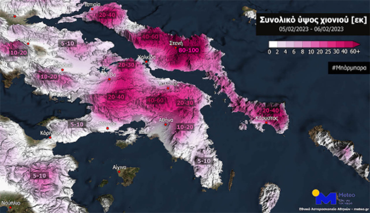 3) Την Τρίτη (07/02/2023) οι χιονοπτώσεις αναμένεται να συνεχιστούν στην ανατολική Ελλάδα από τη Θεσσαλία και νοτιότερα (προσήνεμες περιοχές) καθώς επίσης και στις Κυκλάδες και την Κρήτη, με μικρότερη όμως ένταση.