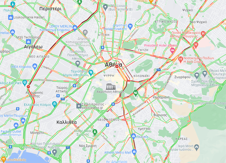 Δυσκολίες παρατηρούνται στην κίνηση των οχημάτων στην Αμαλίας, στη Σταδίου, στην Πανεπιστημίου, στη Σόλωνος, στην Πειραιώς προς Ομόνοια και στην Εθνικής Αντιστάσεως στο ύψος της Δάφνης αλλά και την κάθοδο της Βουλιαγμένης στο ύψος του σταθμού Μετρό Άγιος Ιωάννης.