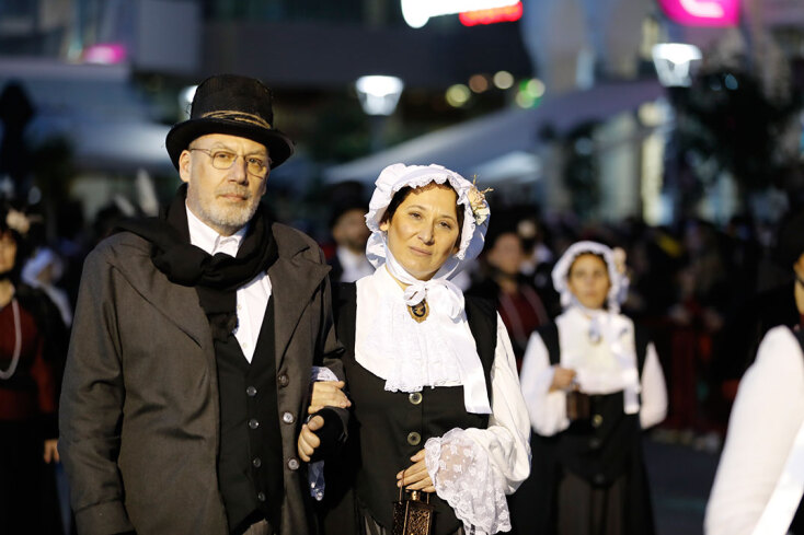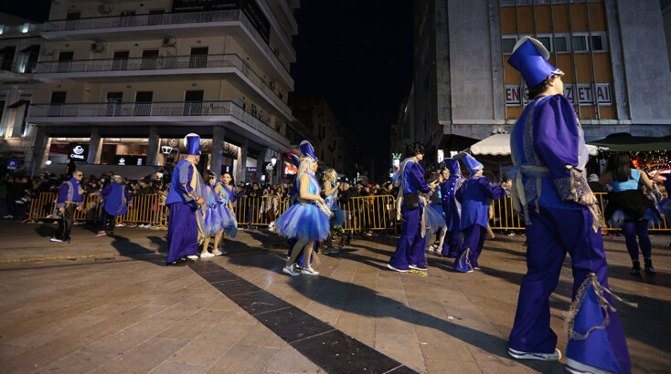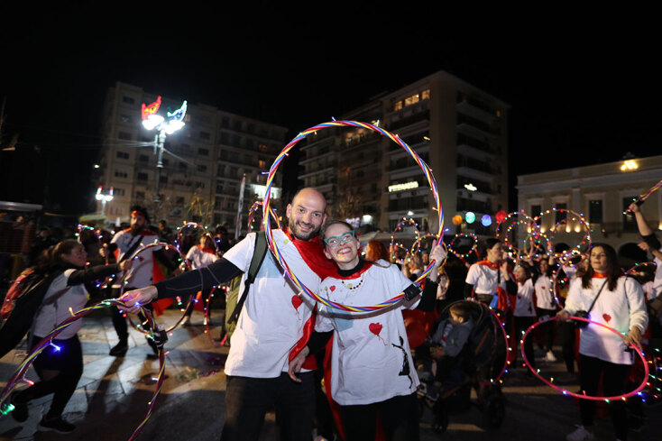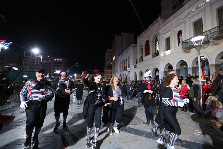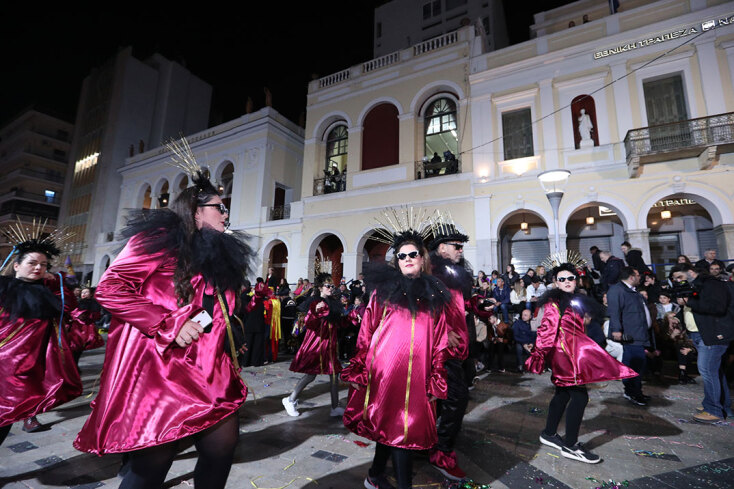 Στο κέντρο της Πάτρας το θέαμα είναι φαντασμαγορικό, με τους φωτισμούς, τη γρήγορη ροή, τα χρώματα και το κέφι να δίνουν λάμψη και μεγαλοπρέπεια στη νύχτα του τελευταίου Σαββάτου του πατρινού καρναβαλιού.