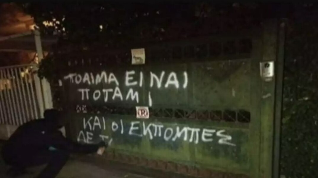 Επίθεση στο σπίτι του Σταύρου Θεοδωράκη καταγράφηκε την ώρα που προβαλλόταν η συνέντευξη του Κυριάκου Μητσοτάκη στον Alpha. Μέλη του Ρουβίκωνα πέταξαν τρικάκια και έγραψαν συνθήματα.