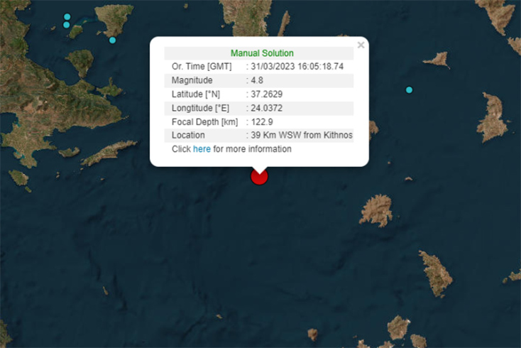 Σεισμός μεγέθους 4,8 βαθμών της Κλίμακας Ρίχτερ σημειώθηκε στις 19:05 της Παρασκευής (31.03) σε θαλάσσια περιοχή της Κύθνου.