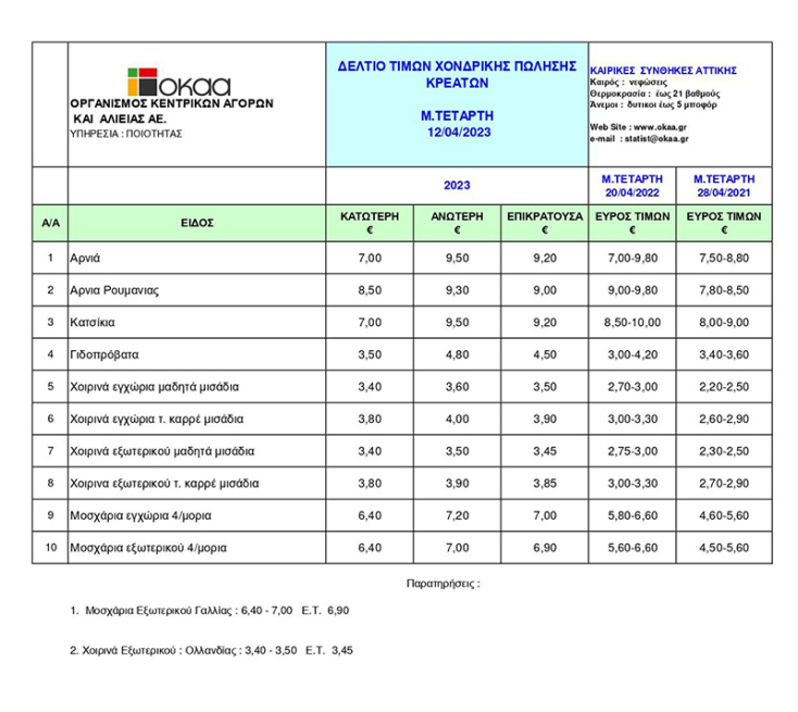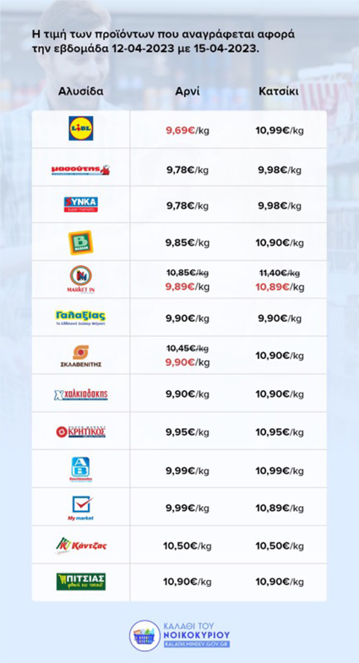 Σε ό,τι αφορά στην τιμή για το αρνί και το κατσίκι, η τιμή συγκρατήθηκε στα περσινά επίπεδα αν και υπήρξε έντονη συζήτηση μεταξύ του υπουργείου Ανάπτυξης και Επενδύσεων και των κτηνοτρόφων και κρεοπωλών για τις τιμές των αμνοεριφίων.