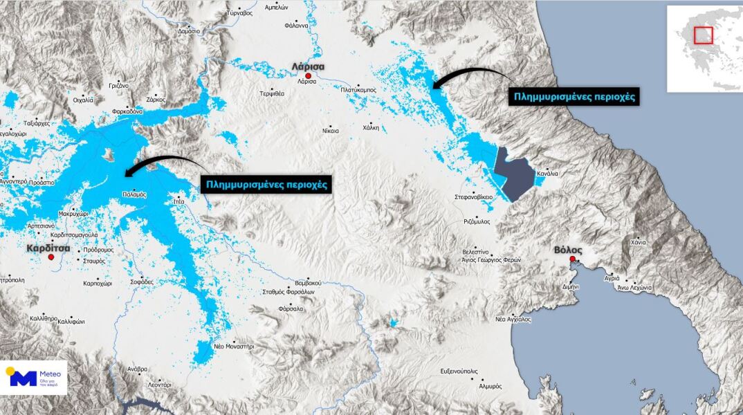 Το μεγαλύτερο μέρος των νομών Τρικάλων και Καρδίτσας έχει κατακλυστεί από τα νερά χειμάρρων και παραποτάμων του Πηνειού. Στην ανατολική Θεσσαλία, η έκταση της Λίμνης Κάρλα είναι σχεδόν ίση με την έκταση που είχε πριν την αποξήρανσή της το 1962.