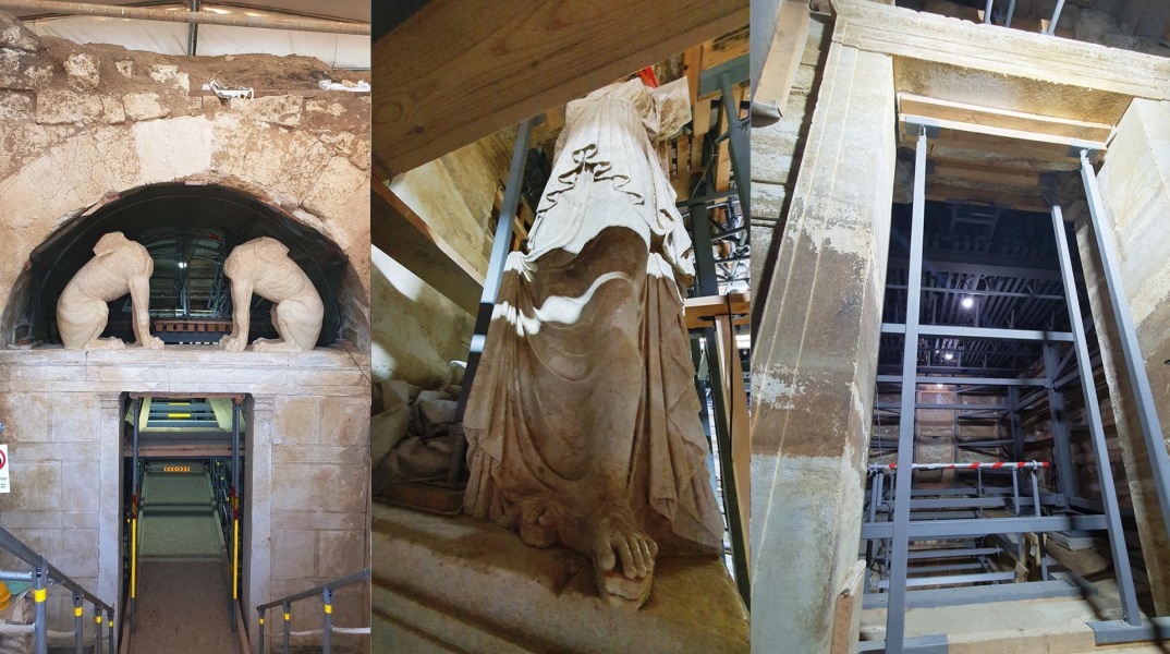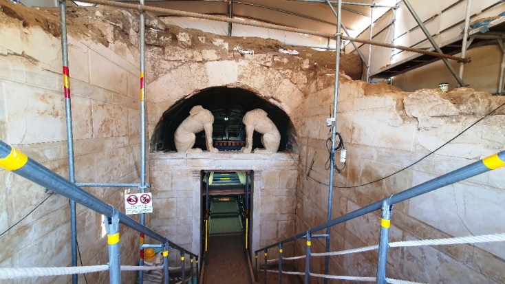 Και μπορεί τα σιδερένια υποστυλώματα, οι σκαλωσιές και το ξύλινο δάπεδο να εμποδίζουν τη θέαση του ταφικού μνημείου σε όλη του την έκταση, ωστόσο, και πάλι, η συνολική εικόνα παραμένει μοναδική.