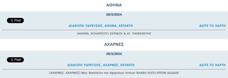 Οι περιοχές που θα γίνουν διακοπές υδροδότησης σήμερα είναι οι εξής: