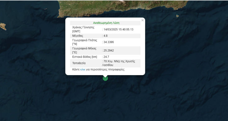 Νωρίς το απόγευμα της Παρασκευής (14.3) καταγράφηκε ισχυρός σεισμός 4,8 Ρίχτερ. To εστιακό βάθος εντοπίζεται στα 24,7 Χλμ και το επίκεντρο στα 70 χλμ ΝΝΔ της Χρυσής Λασιθίου.