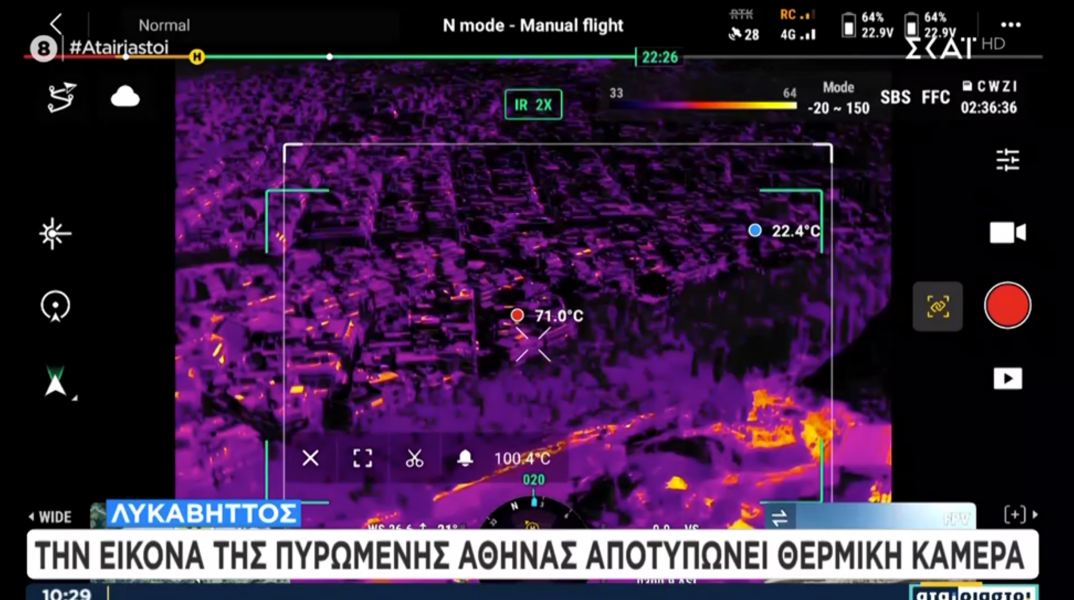 Η θερμική κάμερα του Δήμου Αθηναίων κατέγραψε το πρωί θερμοκρασία έως και 100 βαθμούς Κελσίου σε οροφές κτιρίων και οχημάτων, ενώ στο οδόστρωμα το θερμόμετρο έδειξε έως και 70 βαθμούς Κελσίου.