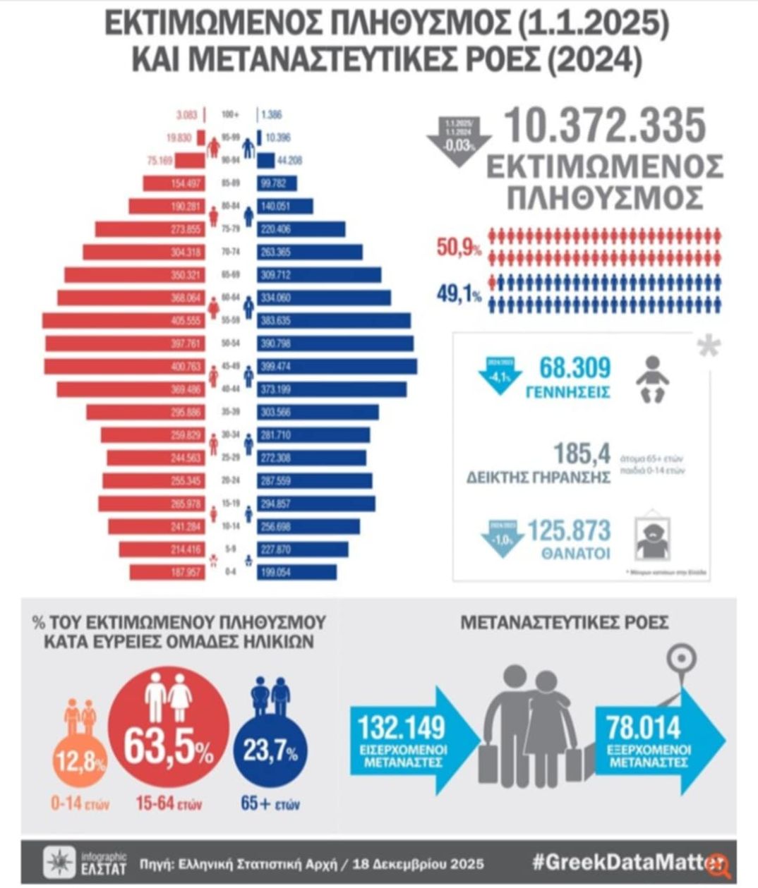 Τα στοιχεία της ΕΛΣΤΑΤ επιβεβαιώνουν ότι, παρά τη συγκυριακή στήριξη από τη μετανάστευση, το δημογραφικό παραμένει μία από τις μεγαλύτερες διαρθρωτικές προκλήσεις για την Ελλάδα, με μακροπρόθεσμες επιπτώσεις στην οικονομία, την αγορά εργασίας και το ασφαλιστικό σύστημα.