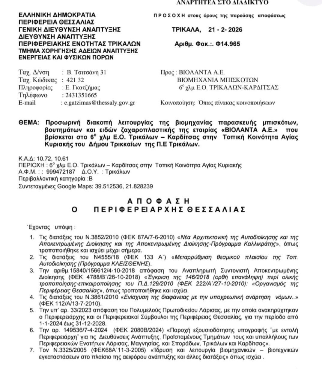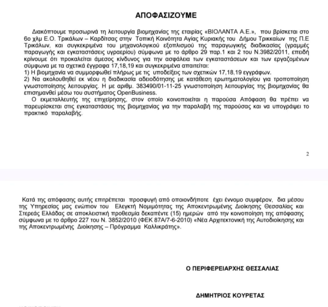Απόφαση Περιφέρειας – Διακοπή λειτουργίας και νέα αδειοδότηση για το εργοστάσιο Βιολάντα
