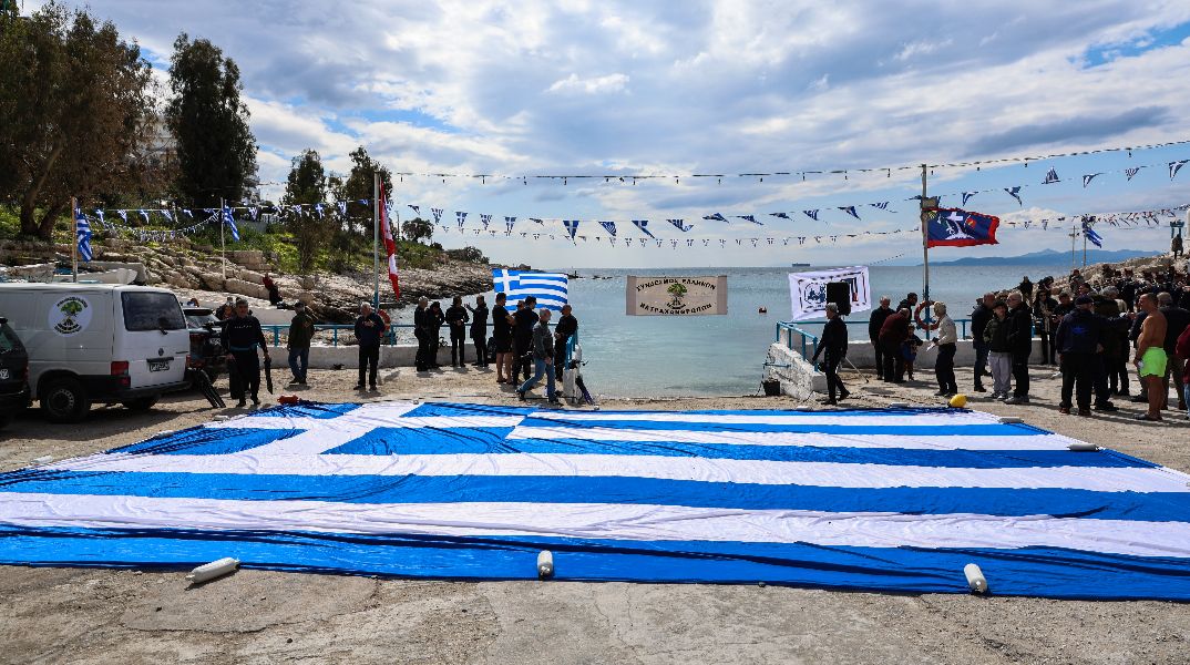 Στις 12:00 το μεσημέρι, στον Όρμο της Αφροδίτης (γνωστό ως «Μπαϊκούτσι»), μέλη του Συνδέσμου Ελλήνων Βατραχανθρώπων πραγματοποίησαν κατάδυση και άπλωσαν στην επιφάνεια της θάλασσας μια τεράστια ελληνική σημαία.