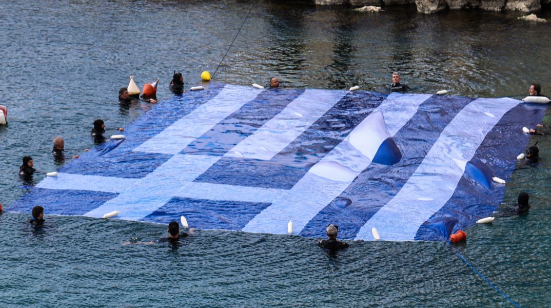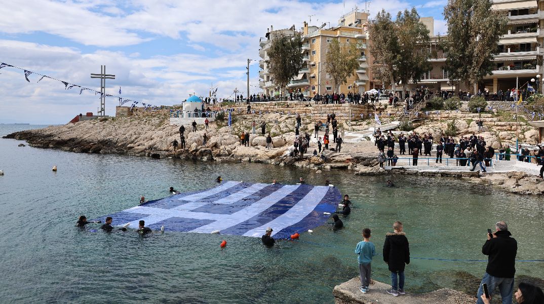 Τεράστια σημαία απλώθηκε στη θάλασσα της Πειραϊκής για την επέτειο της 25ης Μαρτίου