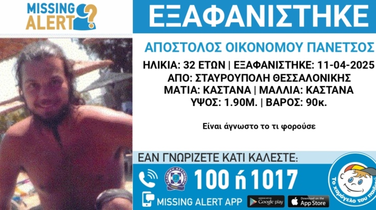 Συναγερμός σήμανε στις Αρχές για την εξαφάνιση 32χρονου Οικονόμου - Πανέτσου Απόστολου από τη περιοχή της Σταυρούπολης Θεσσαλονίκης το απόγευμα του Σαββάτου (11/4).