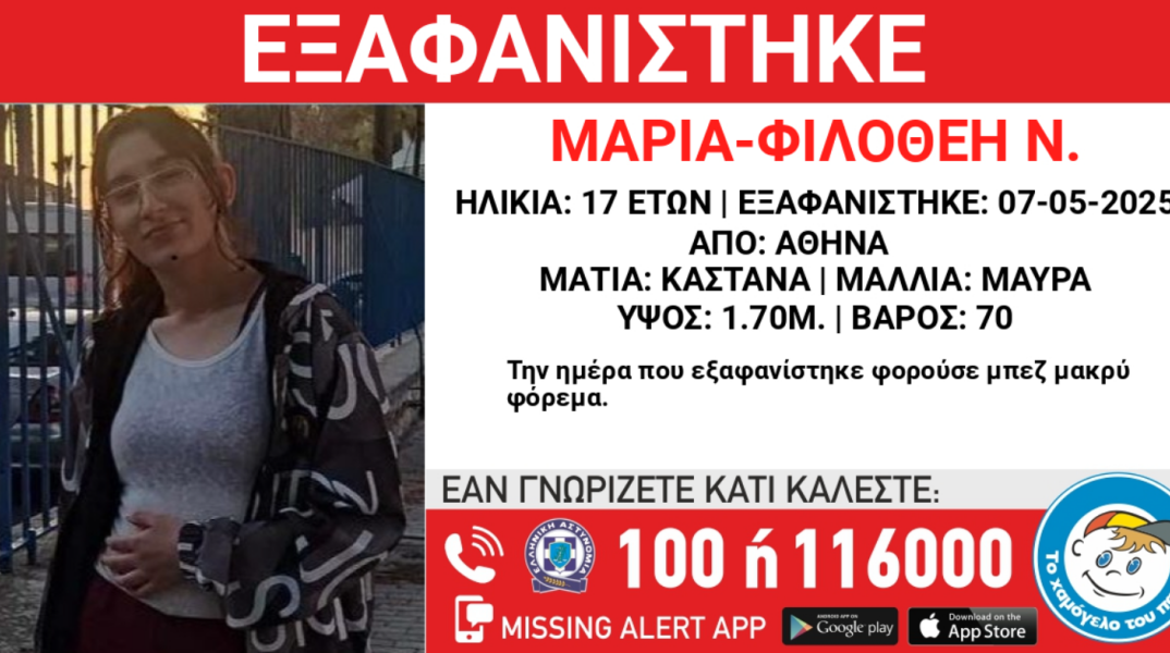 Η Μαρία -Φιλοθέη, Ν., 17 ετών, έχει ύψος 1,70 μ., βάρος 70 κιλά, έχει μαύρα μαλλιά και καστανά μάτια. Την ημέρα που εξαφανίστηκε φορούσε μπεζ μακρύ φόρεμα.