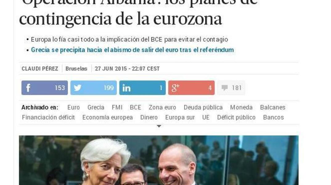 Για σχέδια έκτακτης ανάγκης της ευρωζώνης μετά την απόφαση της ελληνικής κυβέρνησης να πάει τη χώρα σε δημοψήφισμα κάνει λόγο η ισπανική El Pais, με τη συμμετοχή της ΕΚΤ για πρόληψη της μετάδοσης.