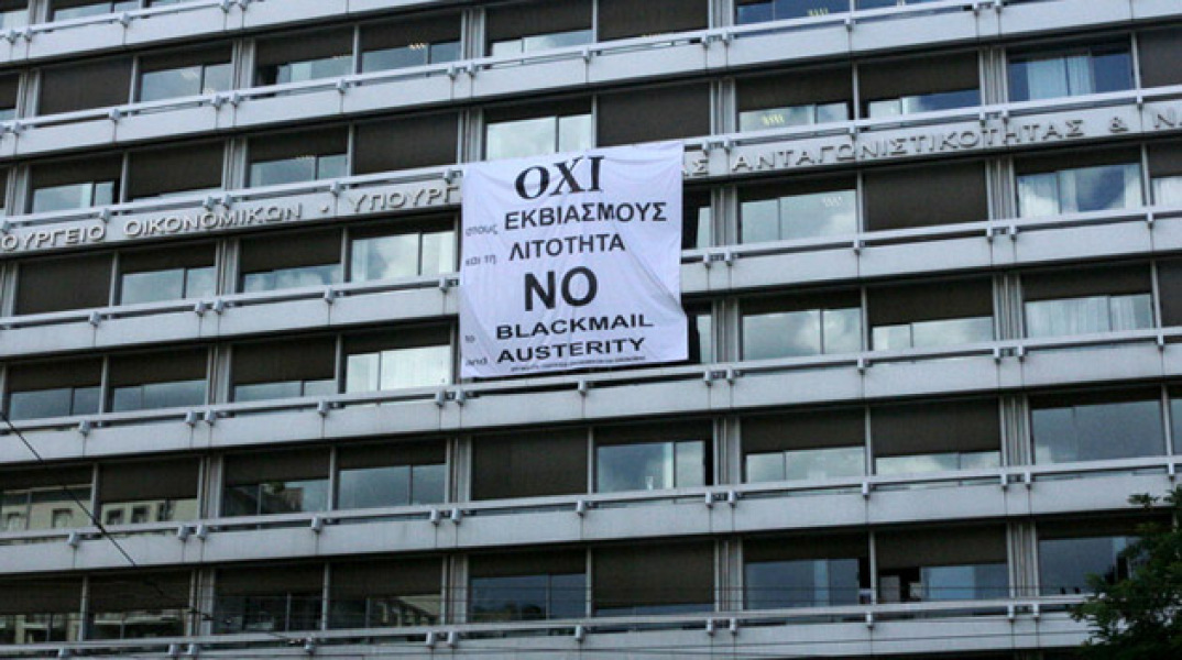 Πανό υπέρ του «ΟΧΙ» στο υπουργείο Οικονομικών