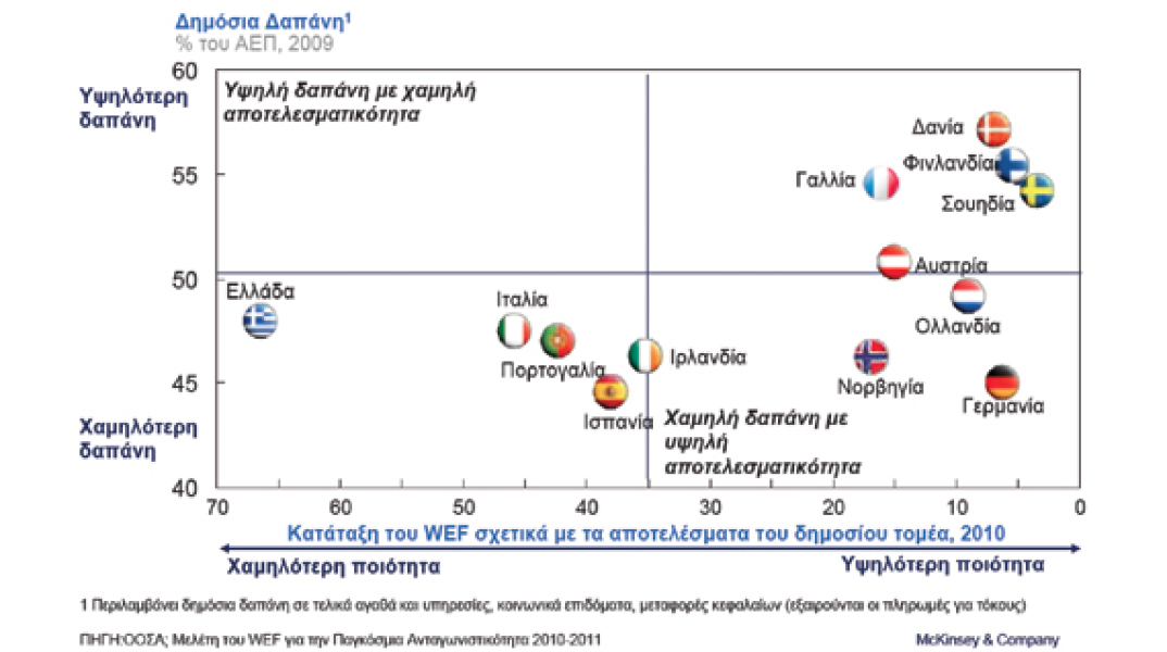 Το διάγραμμα απεικονίζει τη σκληρή πραγματικότητα: ο δημόσιος τομέας στην Ελλάδα είναι ουραγός στην ανταγωνιστικότητα. Κοστίζει πάρα πολύ, χωρίς να προσφέρει υπηρεσίες ποιότητας στους πολίτες, και μπλοκάρει κάθε ιδιωτική πρωτοβουλία.
