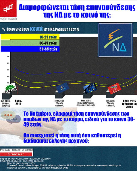 Νέα έρευνα της εταιρείας QED δείχνει ότι από το Νοέμβριο του 2010 προς το Νοέμβριο του 2015 το κοινό της ΝΔ από τους 18ρηδες μέχρι τους 60 άνω, το οποίο είχε απομακρυνθεί από το κόμμα και αναμεταξύ των, τώρα φαίνεται να επανασυνδέεται. Πιο χαρακτηριστική είναι αυτή η τάση για το κοινό των 30 έως 49 ετών. Ωστόσο, είναι άγνωστο αν αυτή η τάση θα συνεχιστεί όσο καθυστερεί η διαδικασία εκλογής προέδρου. Δείτε το σχετικό infographic: