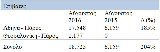 Τριπλάσια η επιβατική κίνηση της Olympic Air στην Πάρο τον Αύγουστο, πρώτο μήνα λειτουργίας του νέου αεροδρομίου που επέτρεψε την χρήση μεγαλύτερων αεροσκαφών. Συγκεκριμένα τον Αύγουστο του 2016, η Olympic Air μετέφερε 18.725 επιβάτες, τριπλάσιους σε σχέση με τον αντίστοιχο μήνα του 2015.