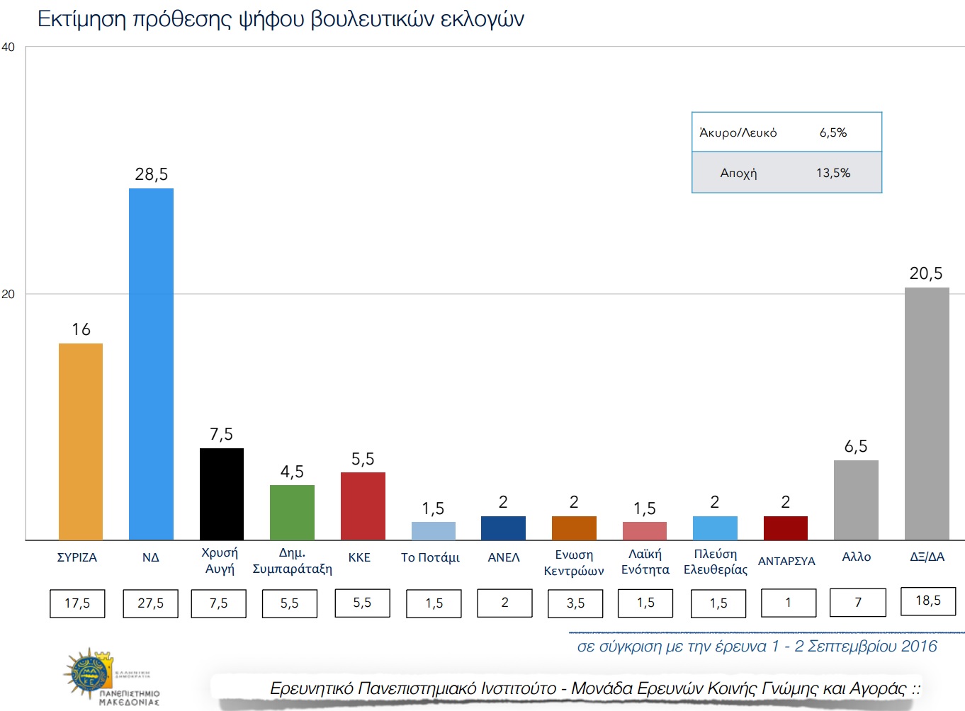 Ειδικότερα, στην πρόθεση ψήφου η ΝΔ καταγράφει 28,5%, ο ΣΥΡΙΖΑ 16% (27,5% και 17,5% αντίστοιχα στην προηγούμενη δημοσκόπηση), 7,5% καταγράφει η ΧΑ, 5,5% το ΚΚΕ και 4,5% συγκεντρώνει η Δημοκρατική Συμπαράταξη. Ενδεικτική είναι και η εικόνα κατακερματισμού στα μικρότερα κόμματα, καθώς από 2% σημειώνουν τέσσερα κόμματα (ΑΝΕΛ, Ένωση Κεντρώων, ΑΝΤΑΡΣΥΑ και Πλεύση Ελευθερίας), ενώ από 1,5% καταγράφουν Το Ποτάμι και η ΛΑΕ. 6,5% αναφέρει ότι θα ψηφίσει άλλο κόμμα ενώ 20,5% δηλώνει «δεν ξέρω/δεν απαντώ».