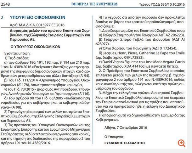 Ειδικότερα σύμφωνα με την απόφαση που υπογράφει ο υπουργός Οικονομικών Ευκλείδης Τσακαλώτος διορίζονται ως μέλη του Εποπτικού Συμβουλίου οι: