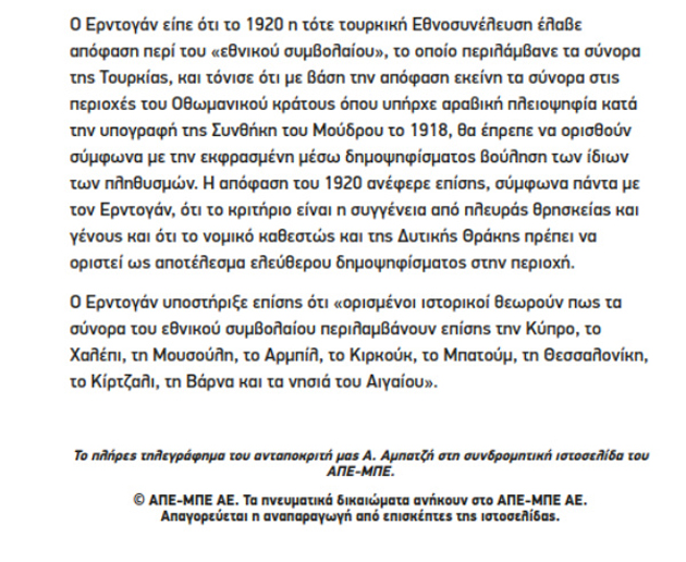 Το τηλεγράφημα του ΑΠΕ ανέφερε ότι ο ίδιος ο Ερντογάν έθεσε ζήτημα δημοψηφίσματος στη Δυτική Θράκη, κάτι το οποίο όμως δεν είναι αληθές καθώς ο Τούρκος πρόεδρος δεν είπε κάτι τέτοιο.