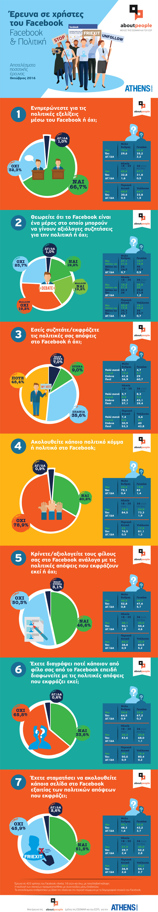 Ένας στους πέντε χρήστες του Facebook ακολουθεί κάποιο πολιτικό κόμμα ή πολιτικό. Οι περισσότεροι είναι άνδρες (24,4%), ηλικίας άνω των 35 (24,9%) και κάτοικοι Αττικής (23%). Όπως εξηγεί στην Athens Voice o πολιτικός αναλυτής της aboutpeople Πέτρος Ιωαννίδης, «το να ακολουθείς κάποιο κόμμα ή κάποιο βουλευτή, δήμαρχο ή υποψήφιο στο Facebook δεν πρέπει να εκλαμβάνεται απαραίτητα και ως υποστήριξη. Ειδικά σε μια περίοδο που οι επιλογές των ψηφοφόρων αλλάζουν τόσο γρήγορα. Σε κάθε περίπτωση όμως κάποιος που έχει αρκετούς followers, έχει τη δυνατότητα να επικοινωνήσει αδιαμεσολάβητα τις θέσεις του ή το έργο του προς αυτούς».