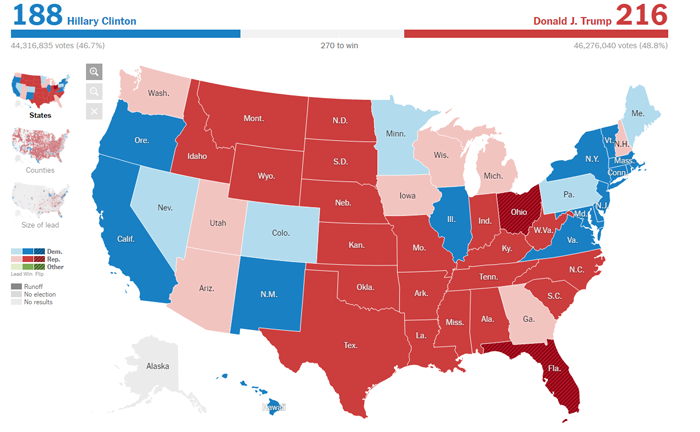 Το δολάριο έπεσε στα 101,46 γεν όταν αναφέρθηκε το ενδεχόμενο να κερδίσει ο Τραμπ την Πολιτεία κλειδί της Φλόριντα, έναντι 105,47 γεν μερικά λεπτά νωρίτερα. Το ευρώ ανέβηκε στο 1,1222 δολάριο, έναντι 1,0989 προηγουμένως.