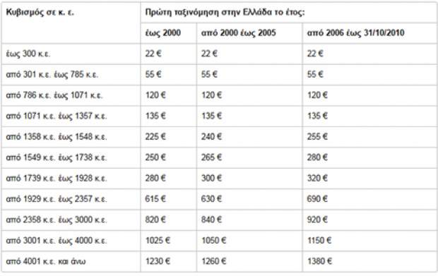 Για επιβατηγά αυτοκίνητα, δίκυκλες και τρίκυκλες μοτοσικλέτες που έχουν ταξινομηθεί ως 31/10/2010, ο υπολογισμός των τελών κυκλοφορίας γίνεται αποκλειστικά βάσει του κυβισμού τους.