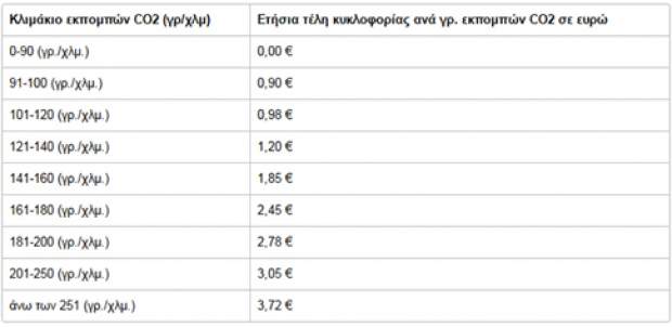 Για όσα αυτοκίνητα και μοτοσυκλέτες ταξινομήθηκαν από την 1η Νοεμβρίου 2010 και ύστερα, τα τέλη υπολογίζονται βάσει της εκπομπής ρύπων. Για να προκύψει το ποσό των τελών, πολλαπλασιάζονται οι εκπομπές ρύπων με την τιμή του αντίστοιχου κλιμακίου από τον κάτωθι πίνακα.