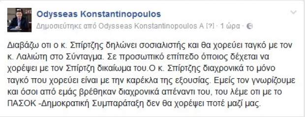Το σχόλιο του Οδυσσέα Κωνσταντινόπουλου στο Facebook για τις δηλώσεις Σπίρτζη