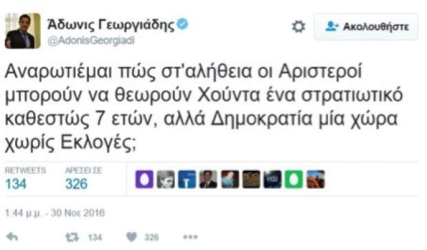 Με το που το είδα η φιλάνθρωπος φύση μου με έκανε να θέλω σκύψω στο αυτί του αντιπροέδρου του κόμματος της αξιωματικής αντιπολίτευσης (αφού πρωτα τον βάλω να κάτσει για να μην έχουμε δυσάρεστες συνέπειες από το σοκ που μπορεί να υποστεί) και να του ψυθιρίσω «Αδωνι, δεν είναι μόνο οι αριστεροί που ξέρουν ότι τα στρατιωτικά καθεστώτα και οι χούντες είναι το ίδιο πράγμα». Μετά, όμως, σκέφτηκα πως καλό είναι να μη μιλάω εγώ για τις δικές του πεποιθήσεις. Και μπράβο μου.