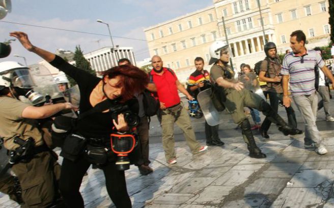 Κεντρική φωτό: Ο φωτορεπόρτερ Θανάσης Σταυράκης του Associated Press (AP), δέχεται επίθεση με γκλομπ από άντρα των ΜΑΤ, ενώ κάλυπτε φωτοειδησεογραφραφικά τα επεισόδια της 29ης Ιουνίου 2011 στο κέντρο της Αθήνας.