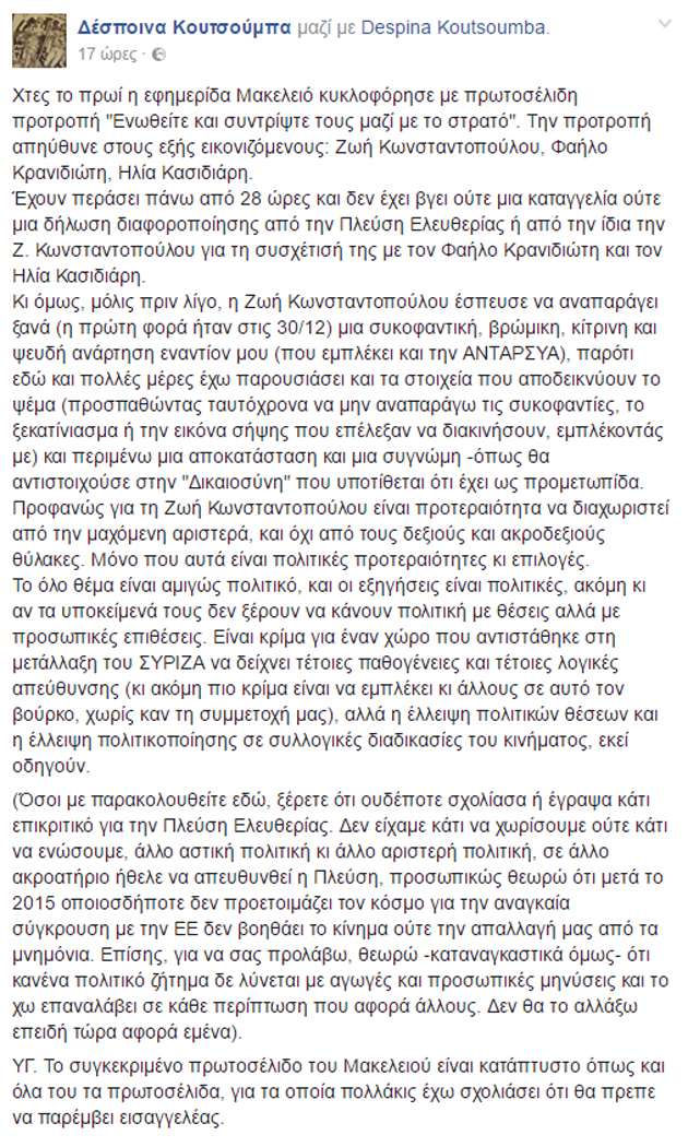 Μέσω Facebook απάντησε και η Δέσποινα Κουτσουμπά κάνοντας λόγο για ψεύδη και ξεκατίνιασμα. Μεταξύ άλλων αναφέρει «προφανώς για τη Ζωή Κωνσταντοπούλου είναι προτεραιότητα να διαχωριστεί από την μαχόμενη αριστερά, και όχι από τους δεξιούς και ακροδεξιούς θύλακες».