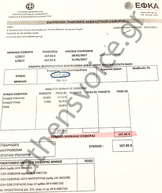 Όπως φαίνεται στο πρώτο ειδοποιητήριο, κάποιος που δήλωσε μηδενικό εισόδημα θα πληρώσει το κατώτατο όριο. Δηλαδή 117,22 ευρώ για σύνταξη, 40,73 ευρώ για υγεία ενώ προστέθηκε ότι θα πληρώνει και εισφορά υπέρ ΟΑΕΔ 10 ευρώ! Σύνολο 167,95 ευρώ κάθε μήνα ενώ έχει μηδενικό εισόδημα!