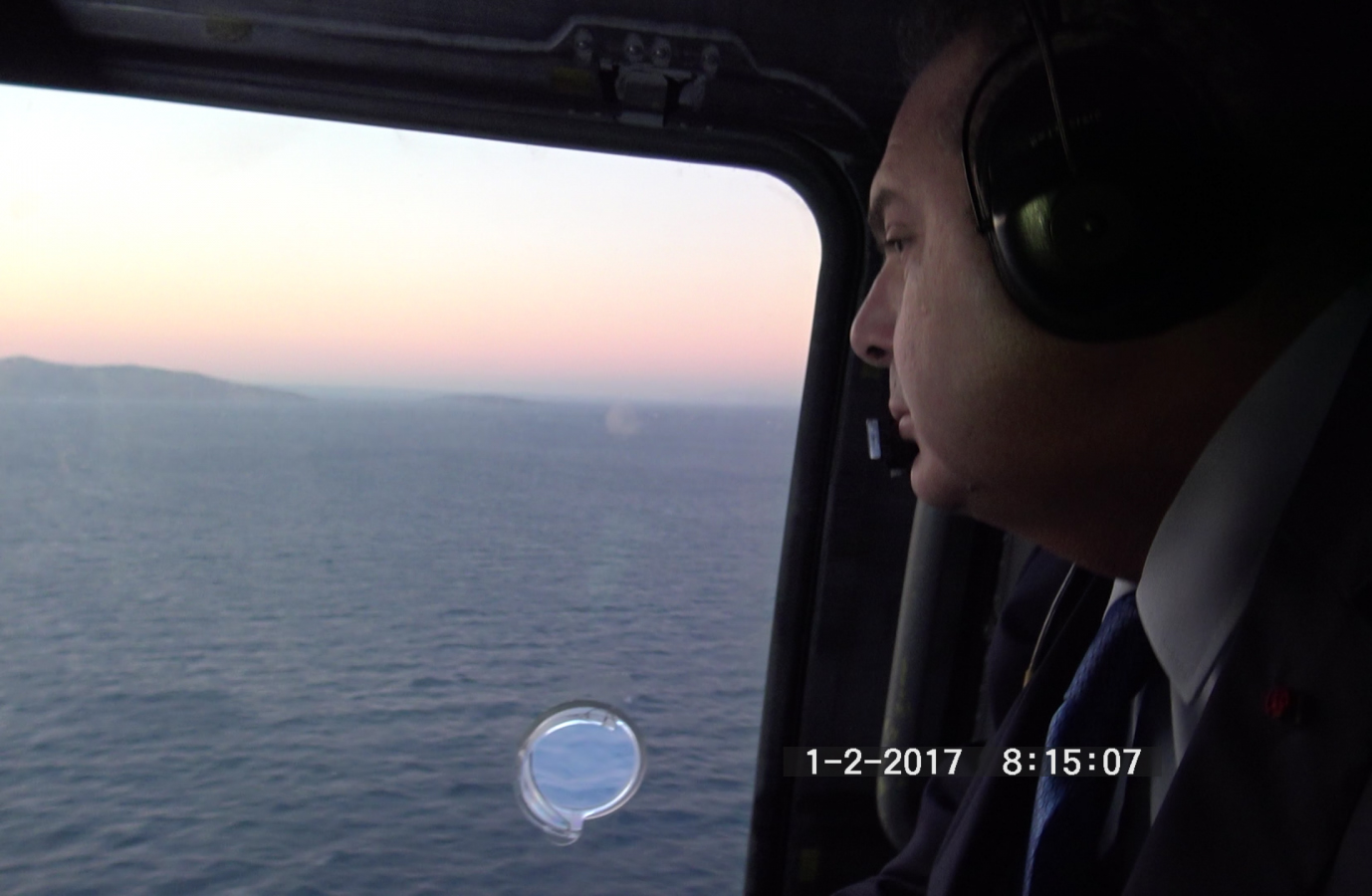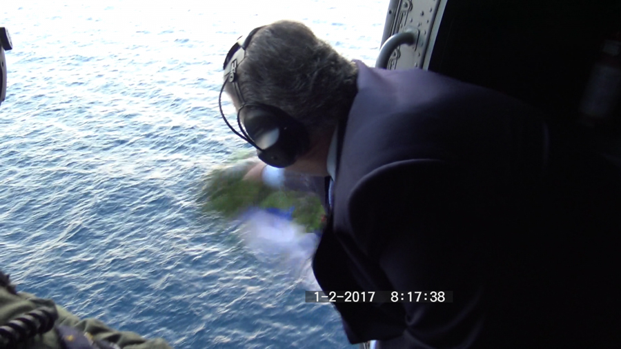 Ο Υπουργός Εθνικής Άμυνας πέταξε με ελικόπτερο S-70 Aegean Hawk και έριξε στεφάνι εκεί για να τιμήσει τη μνήμη των τριών Ελλήνων αξιωματικών του ΠΝ που έχασαν τη ζωή τους τη νύχτα της Κρίσης των Ιμίων το 1996.