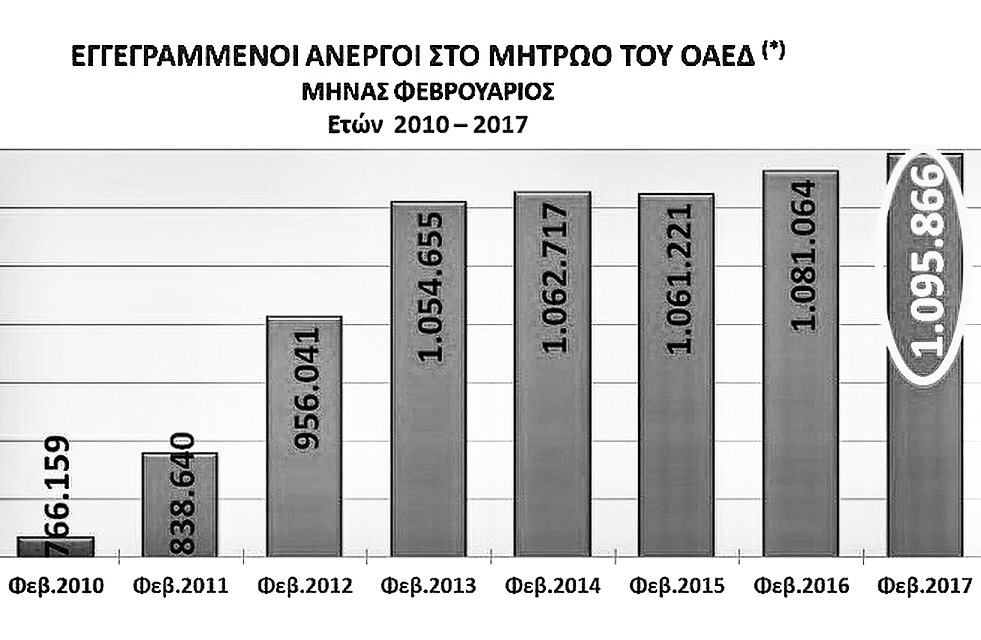 Σύμφωνα με τα δελτίο του ΟΑΕΔ, τον Ιανουάριο του 2017 οι άνεργοι αυξήθηκαν, όπως φαίνεται στο γράφημα, σε 1.089.989 άτομα. Ο αριθμός αυτός είναι ο υψηλότερος που έχει καταγραφεί για τον μήνα Ιανουάριο τα τελευταία 7 έτη!
