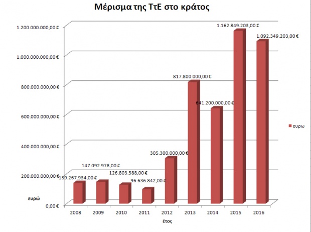Στο γράφημα απεικονίζονται πόσα λαλάκια ανά έτος συνεισφέρει η «ιδιωτική» Τράπεζα της Ελλάδας στα κρατικά ταμεία, έτσι όπως προκύπτει από τους ισολογισμούς της. Τα τελευταία 5 χρόνια υπερήφανων αντιμνημονιακών κυβερνήσεων η ΤτΕ έχει σπρώξει στα κρατικά ταμεία 4 δις ευρώ. Έναμισι ένφια καβάτζα. Δεν τα λες και λίγα! Όσο πιο χάλια τα πάει η εκάστοτε κυβέρνηση τόσο περισσότερα κέρδη μοιράζει ως μέρισμα η ΤτΕ στο υπουργείο Οικονομικών για να χρηματοδοτήσει τον κρατικό προϋπολογισμό. (Και αυτά από τις δικές μας τσέπες βγαίνουν.)