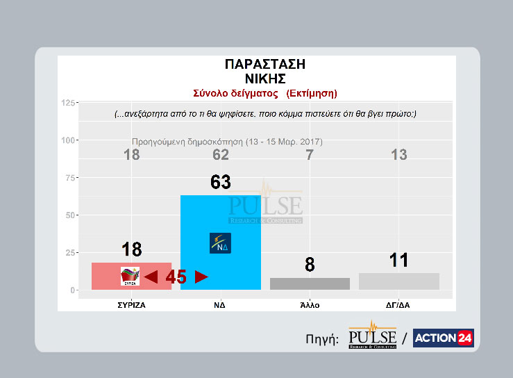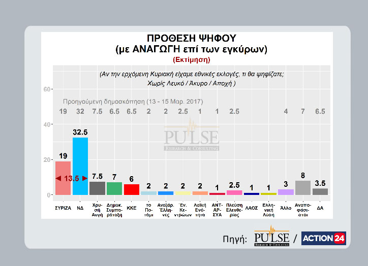 Προβάδισμα της ΝΔ με 13,5 μονάδες έναντι του ΣΥΡΙΖΑ, καταγράφει δημοσκόπηση της Pulse που έγινε για λογαριασμό του Action24 και την εκπομπή Evening Report.