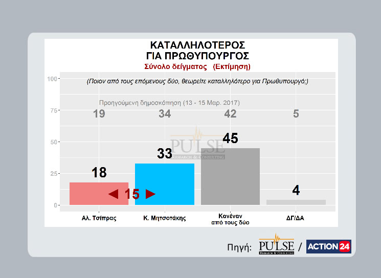 Στο ερώτημα για το ποιός είναι καταλληλότερος πρωθυπουργός, ο Κυριάκος Μητσοτάκης προηγείται με 15 μονάδες του Αλέξη Τσίπρα.