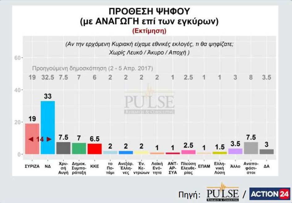Στην πρόθεση ψήφου με αναγωγή επί των εγκύρων, η διαφορά ανεβαίνει στο 14% καθώς η ΝΔ συγκεντρώνει 33% έναντι 19% του ΣΥΡΙΖΑ.